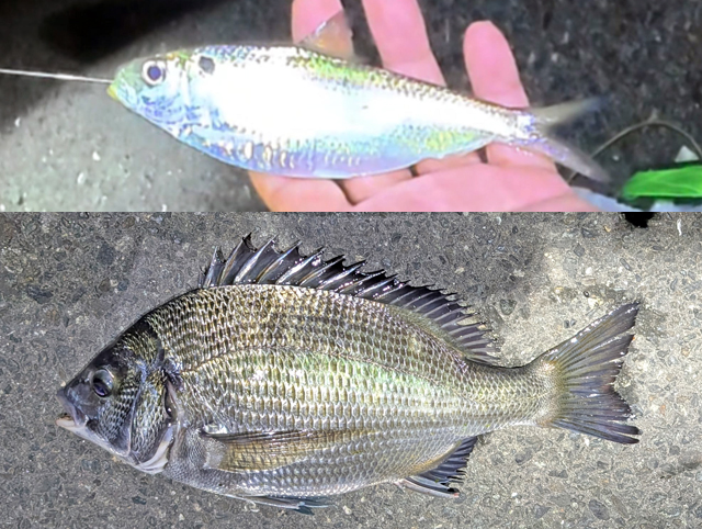 7月22日 三重県勢田川河口 前打ち、落とし込みクロダイ、チビレ